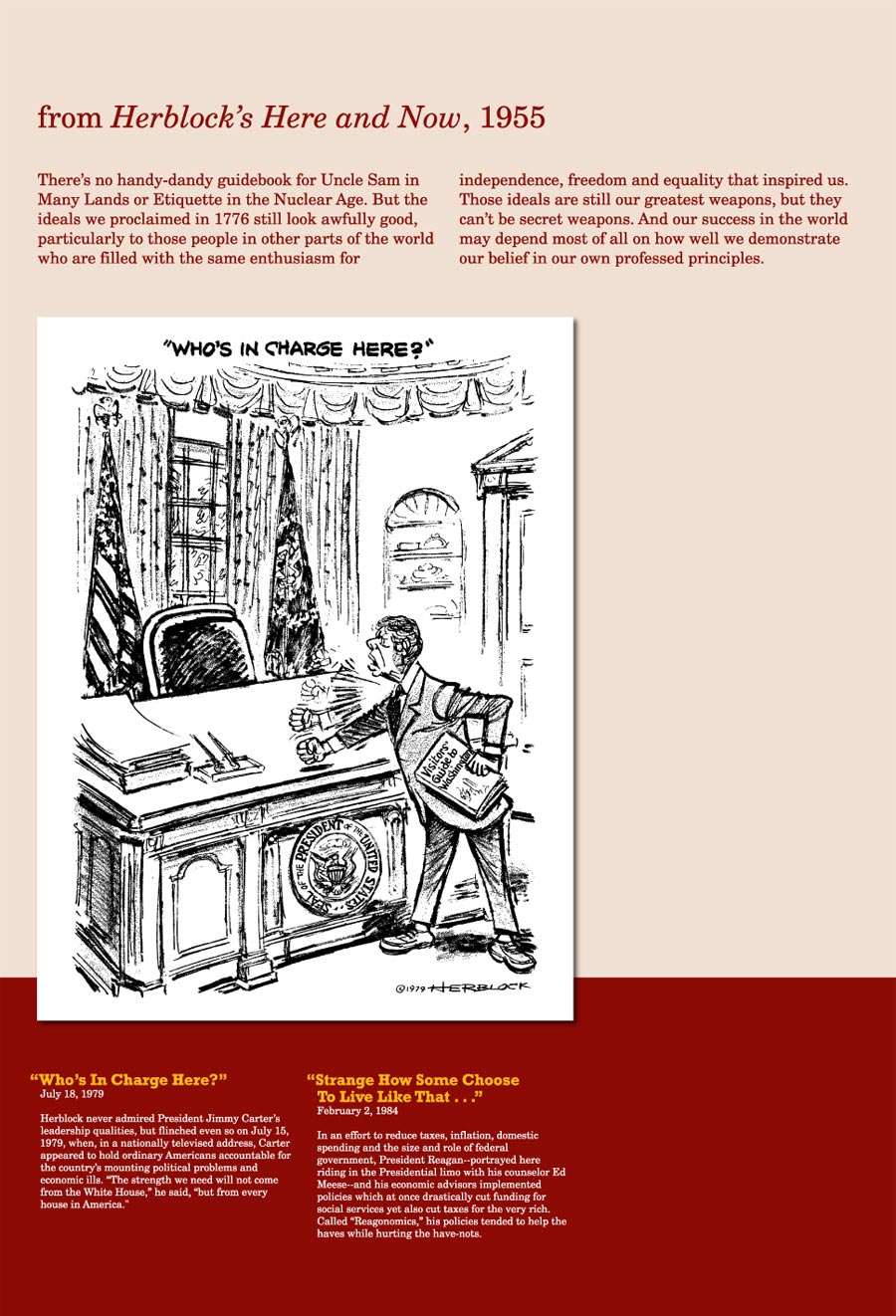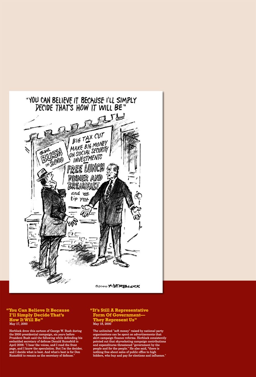 Herblock believed that America was and is the greatest nation the world has ever seen. The man that he was and the work that he produced was, in itself, an exercise in freedom of speech, freedom of the press and equality. Herblock used his talents to present important questions and challenges that words alone cannot: We must vote, meet our civic responsibilities, pay taxes and expect the best of our elected government officials to work on behalf of all the people. The clarity of his message and artistic style were perfectly fused, providing transparency, a humorous and telling look at our leaders, ourselves and the world.