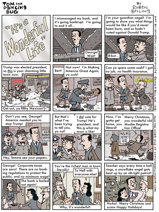 Ruben Bolling is the author of the weekly comic strip “Tom the Dancing Bug,” distributed by Andrews McMeel Syndication to many newspapers across North America It also appears on: BoingBoing.net, one of the most linked-to websites in the world; DailyKos.com, the U.S.’s largest progressive blog; and Gocomics.com, the largest comic strip website.