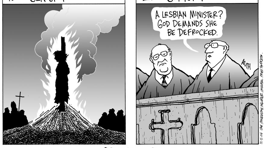 Most importantly, I wish to thank The Philadelphia Inquirer, which for 34 years, and under the leadership of a variety of editors and publishers has been nurturing, encouraging and tolerant when I've come very close to, or actually gone over the cliff. Amanda Bennett, the current editor of The Inquirer, is one of the relatively small number of editors in the country who understand that the best cartoons are, by definition, going to infuriate some of our readers. She has defended my independence on numerous occasions, and has a long history as a defender of outraged cartoonists, and some would say outrageous cartoons. When she was editor of the Lexington Herald-Leader, hers was one of only five papers in the country that published Pat Oliphant's memorable drawing on the child sexual abuse scandal in the Catholic Church entitled "Celebration of spring at Saint Paedophilia's , the annual running of the altar boys." She was the only editor to have published that drawing who didn't apologize for having done so, and she actually published it again on a page devoted to angry letters denouncing the cartoon and the Herald-Leader.
